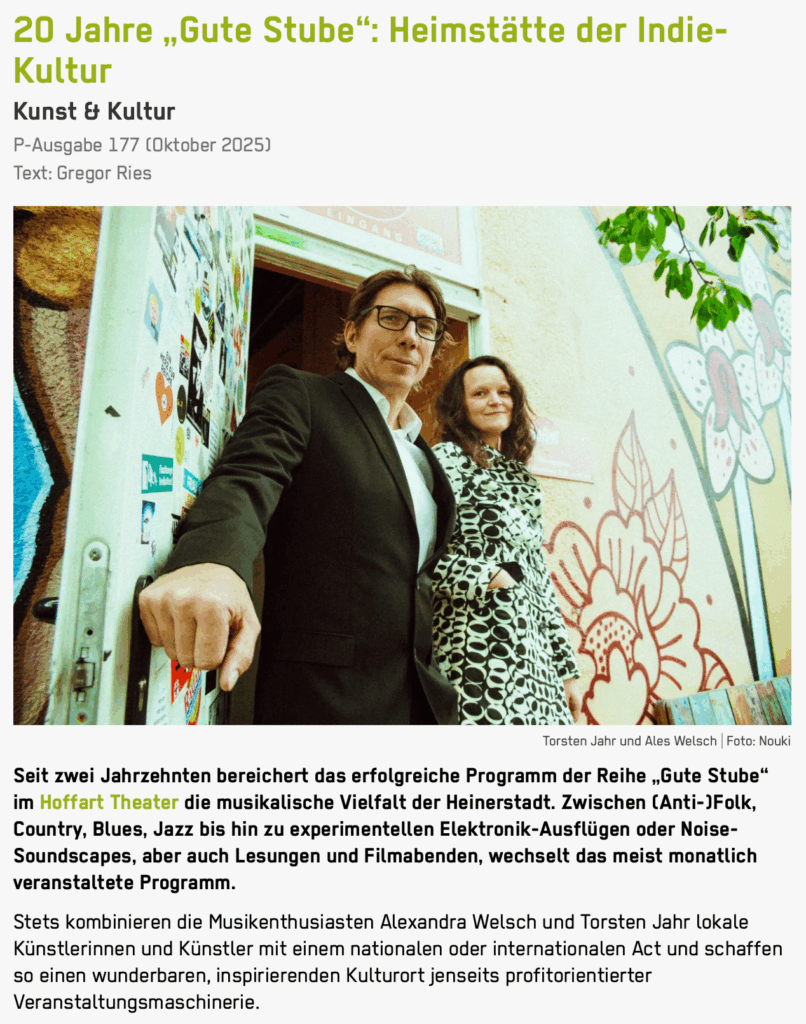 Letztes Mal noch Gäste, dies mal schon als Live-Act dabei: We proudly present….zwei schillernde Persönlichkeiten der Darmstädter (Sub)-Kulturlandschaft. Niemand anderes als Chefin und Chef der „GUTEN STUBE“ und vieler anderer lokaler Events und Festivitäten: Alex und Torsten! Wir freuen uns außerordentlich darüber. Jetzt also Gäste und Platten-Aufleger:innen! MERCI! Und natürlich langjährige Supporter der Lilien auf G1. Wichtig!